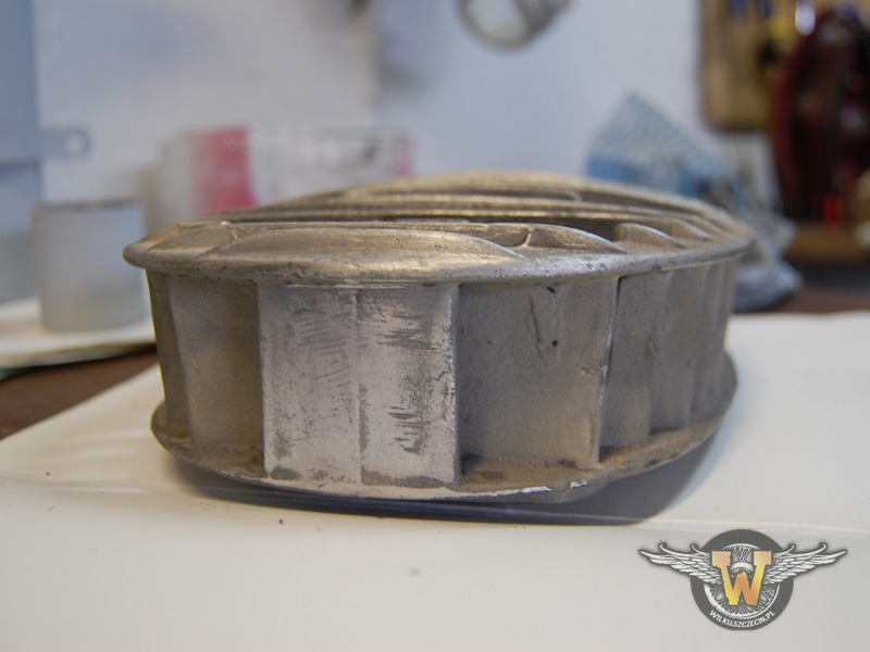 Zacznijmy od tego jak wyglądały na silniku... Tutaj sesyjka już po demontażu. Próbowałem się za nie zabrać, jednak ciężko dostać się w zakamarki między żebrami. Musnąłem bardziej wystające elementy włókniną na wiertarce. Bez piaskowania nie obejdzie się :/ Poniżej fotki pierwszej wypiaskowanej... Tej w lepszym stanie: Po piaskowaniu jest lepiej. Przynajmniej widać, że robota jako tako idzie do przodu. Niemal przy każdej aluminiowej rzeczy marudzę, że ciężko, trudno, masakra... Ale głowice to robota na długie miesiące. Nie wiem jak Leon dał radę wypolerować żebra głowicy do swojej Jawki tak jak pokazał mi na zdjęciu... Pochlastać się można... Nie wiem czy na tych zdjęciach będzie dobrze widać, ale jest całkiem nieźle. Niestety głowice są trochę podniszczone i niektóre kuksańce będą musiały zostać. No cóż... Ze starego nie da się zrobić nowego... A tutaj druga, po piaskowaniu. Ta to dopiero dostała po dupie. Zastanawia mnie jak te uszkodzenia mogły powstać. Wygląda jakby ktoś wycebanił w jakiś murek, albo coś podobnego. Chociaż... Nie wiem. Z obu stron jest tak porezana, że po pierdyknięciu w murek musiałby cofnąć :) Poza uszkodzeniami proszę zwrócić uwagę na odlew :) Rzeźba sztuki nowoczesnej :) To będzie ciężka robota. I najgorzej, że muszę skończyć żeby złożyć silnik... :/No dobra to mały apdejt danych... Głowice nie zostały wypolerowane. Nie zrobiłem tego z obawy o problemy z temperaturą silnika. Jako, że gładkie elementy mają mniejszą powierzchnię oddawania ciepła coś musiałem chropowatego zostawić. No i roboty by z tym było, że szkoda gadać ;).