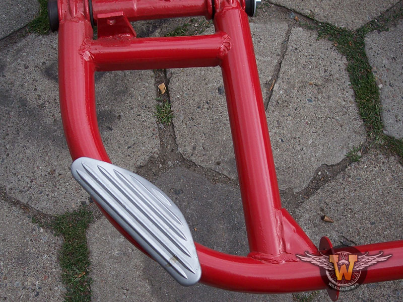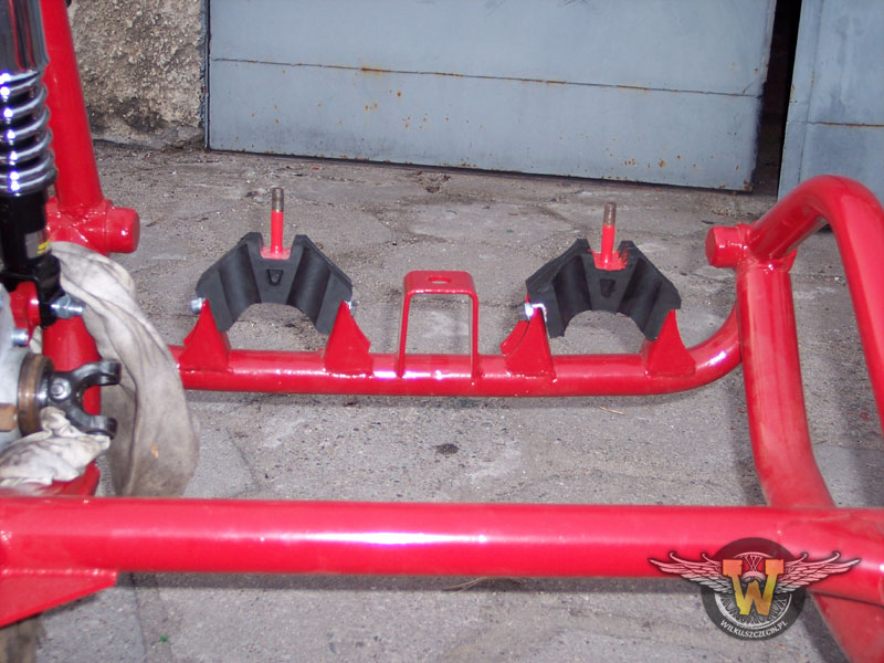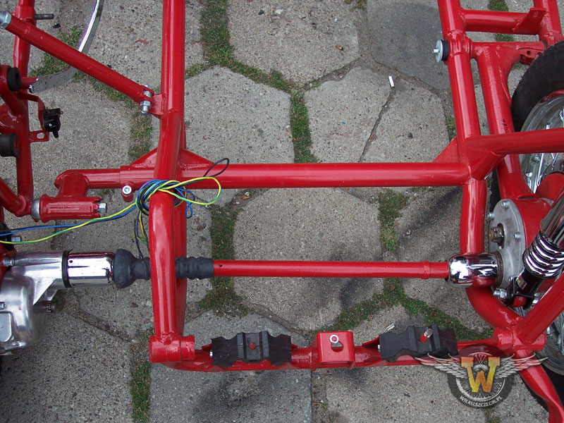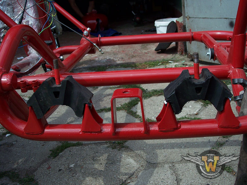 Tutaj już po malowaniu. Zdecydowałem się pomalować ramę proszkowo, żeby lakier był trwalszy. Jest to element nisko zawieszony bardzo narażony na uszkodzenia mechaniczne. Nie wygładzałem spawów przed malowaniem. Uznałem, że w tym wypadku nie ma to sensu... Jak widać po pająku :) trochę już stoi w warsztacie. Dalszy etap? Montaż wahacza...