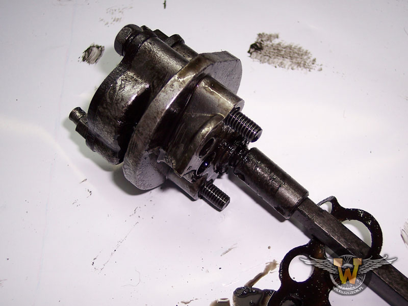 Na początek zobaczmy jak to było wcześniej. Olej został spuszczony na zimno, ale spuszczał się na tyle długo, że po zdjęciu michy resztki można było wytrzeć szmatą. W misce zebrał się mazut, którego nic nie chciało zmyć :) Nie wiem czy przypadkiem do dziś tam jest :)Zakrętka otworu przy zębatce napędowej pompy oleju była uszczelniona dratewką :) Jeszcze jakiś czas temu było to dla mnie śmieszne, ale tak właściwe to przy braku uszczelek pomysł najlepszy z prostych. I tutaj pompa... Chyba najbardziej zagadkowe urządzenie w tych motocyklach. Niesamowite jest to, że tak niepozorne urządzenie odpowiada za działanie silnika. Kilka razy sięgałem po schematy, bo nie dowierzałem w dwie zębatki pompujące olej w magistralę wystarczą do posmarowania tych - co prawda - niewielu części, ale jakże wrażliwych na brak lubrykantu... W związku z polerką silnika przez co silnik stracił mnóstwo powierzchni do oddawania ciepła zmuszony byłem zastosować głęboką michę olejową. Jest ona poważnie głęboka :) No i niestety wisi nisko nad ziemią :/- przymierzałem już blok w ramie. Mam nadzieję, że jej nie rozpierdaczę na jakimś krawężniku. No niestety. Zachciało się polerki? No to teraz trzeba szukać autostrad z górki... :/ Na razie wystarczy :)