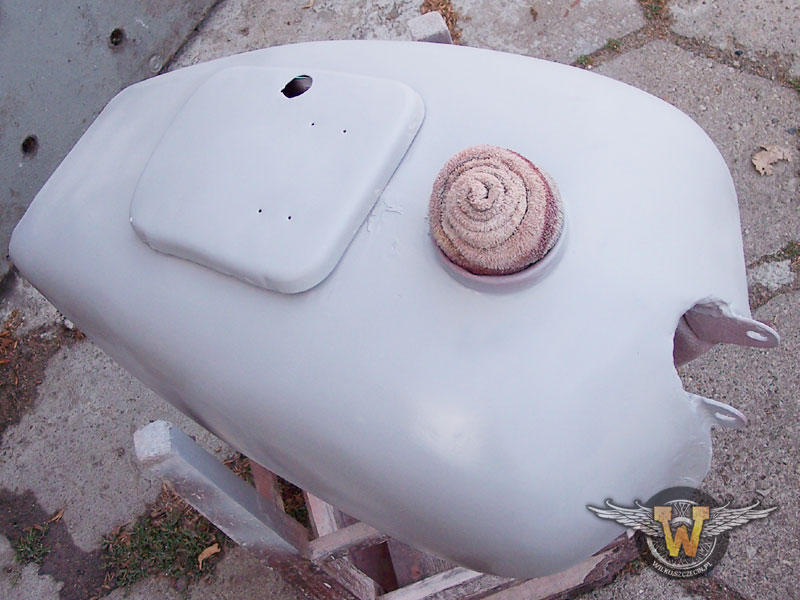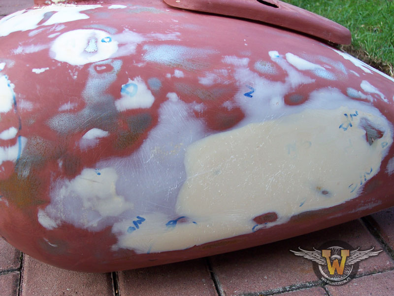 Bak :) Oczywiście zmieniony na ładniutki i okrągły zamiast obrzydliwego kanciaka. Kwadratuwy oczywiście też zaprezentuję :) Nawet nie był najgorszy. Niewielkie rysy, jedna wgniotka... Nie pasował mi do koncepcji. Tutaj bak z Niebieskiego. Z jakiego motocykla trafił do Niebieskiego tego nie wiem. Może z K750? Może MT9... W każdym razie - jak widać - poniosło mnie odrobinkę i zamiast usunięcia tylko uszkodzonych miejsc z nałożonym szpachlem postanowiłem zedrzeć całość. Oczom moim ukazał się obraz nędzy i rozpaczy :/ Ktoś się nieźle narzeźbił wyprowadzając ten zbiornik. Teraz niestety czeka to mnie :/ I zabrałem się do roboty... Na duże doły położyłem szpachel z włóknem. Powinien lepiej trzymać i być mniej wrażliwy na wstrząsy i uderzenia. :/ Wydawało mi się, że pomazianie baku szpachlem to tyle co pierdnąć... Jakbym miał tak pierdnąć to z dupy armata by była... Tyle roboty co przy zbiorniku to chyba tylko przy polerowaniu bloku było... Muszę studzić swój zapał, żeby nie malować za szybko na czerwono, żeby wszystko ładnie powyciągać, przeszlifować, żeby szpachel, którego jest od groma dobrze wysechł. Wszystko według sztuki... W końcu udało się :) Pomaziany na kolorowo :)Tylko oczywiście musiałem spierdolić :/ Inaczej się tego nie da nazwać. Bak był zdjęty z Niebieskiego. A niebieski co miał? Kanapę. I czego nie miał? Rury do przedniego mocowania siedzenia sercowego... I kuźwa... Kiedy zorienotwałem się, że coś nie bangla? Szkoda słów :) Przyznaję się bez bicia... Skrewiłem :/ Cierpliwości mi zabrakło i musiałem wyciąć dziurę w zbiorniku pomalowanym już pierwszą warstwą farby. Na szczęście udało się jakoś wybrnąć z sytuacji. Operacja wycinania wspawanej blachy zakończyła się pełnym sukcesem. Wyrezałem odpowiednią dziurę i teraz wygląda jak trzeba.